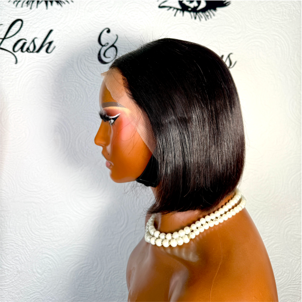 This is a beautiful, sleek bob wig that’s perfect for a chic and polished look. The wig features a realistic hairline, giving the illusion that the hair is growing directly from the scalp. Its classic bob cut is styled to fall just below the jawline, creating a clean, sharp silhouette. The hair itself is a rich, natural black color and has a smooth, straight texture with a healthy, glossy shine. The cut is versatile enough for both professional and casual settings.