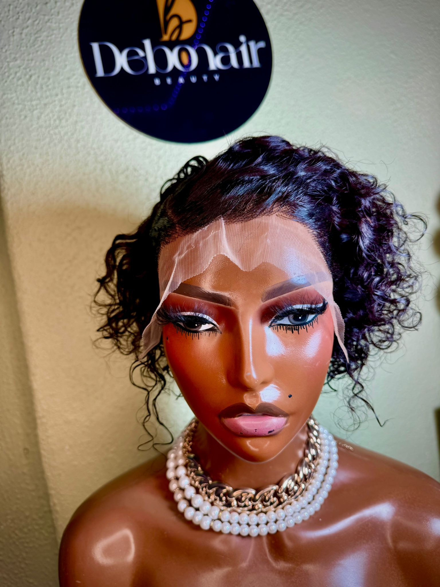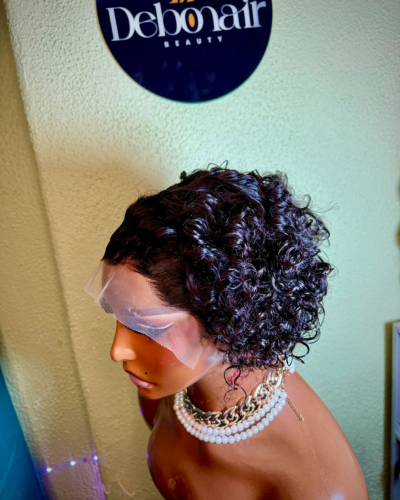 This image shows a 13×4 frontal wig with a short, curly hairstyle displayed on a mannequin head. The wig has a natural-looking hairline, thanks to its lace frontal construction, and the dark, bouncy curls.