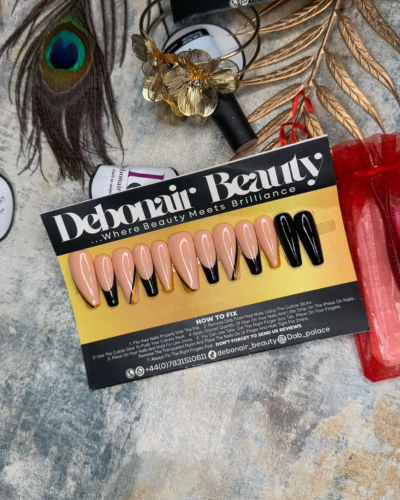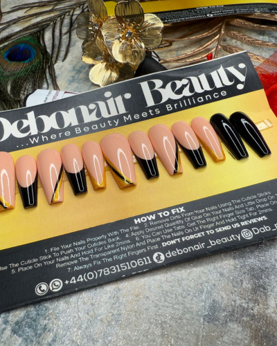 This is a beautiful set of high-quality press-on nails featuring a modern twist on the classic French manicure. The set includes a mix of styles, including glossy black and delicate nude nails with sharp, V-shaped tips. A subtle yet elegant gold stripe adds a unique and luxurious detail to a few of the nails, making this set perfect for a sophisticated look that stands out. The kit is designed for easy application, providing a salon-quality manicure in minutes.