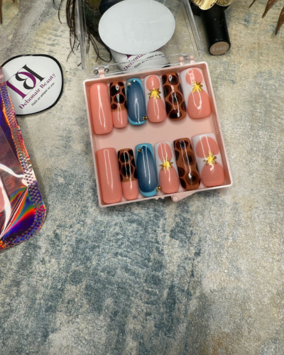 Unleash your wild side with the chic Giraffe Print Accent Nails. This highly-curated set features a stylish blend of design elements: solid peachy-nude nails, striking giraffe animal print nails, and cool dusty blue accent nails. The look is completed with glamorous 3D gold starburst charms and tiny gold beads on the accent nails. This is a trendy, fashion-forward manicure that flawlessly combines modern neutrals with a touch of exotic flair.