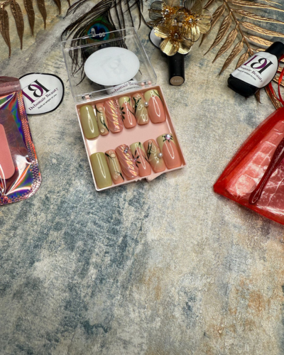Color Palette:Matte Olive Green, Peachy Nude, Black/Green Floral, Gold/Metallic Swirls