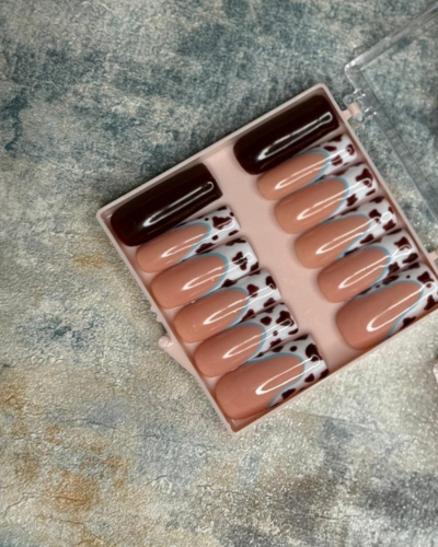 Bring a chic twist to your style with the Mocha Cowgirl Press-On Nails. Featuring a soft nude base paired with playful cow-print tips in rich brown and white, this set blends trendy design with everyday versatility. The bold mocha accent nails add a striking contrast, making this set perfect for fashion-forward looks that turn heads.