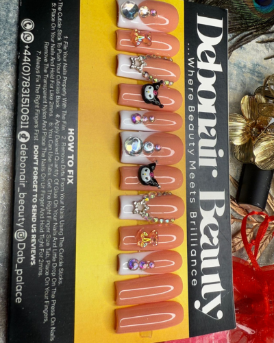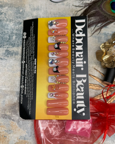 Color Palette:Nude/Pink Base, White Tip, Clear Crystals, Black/White Charms